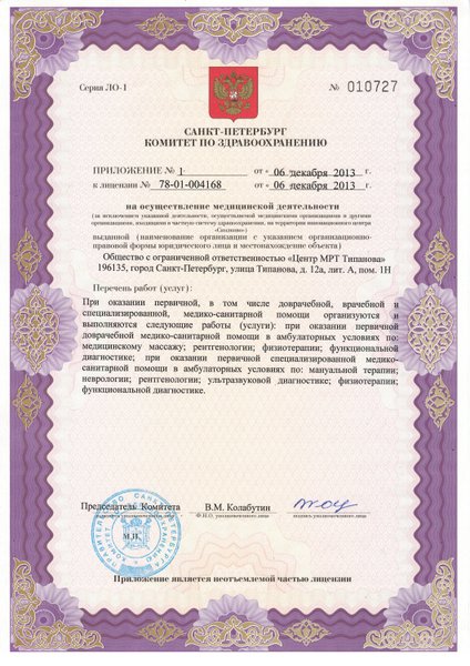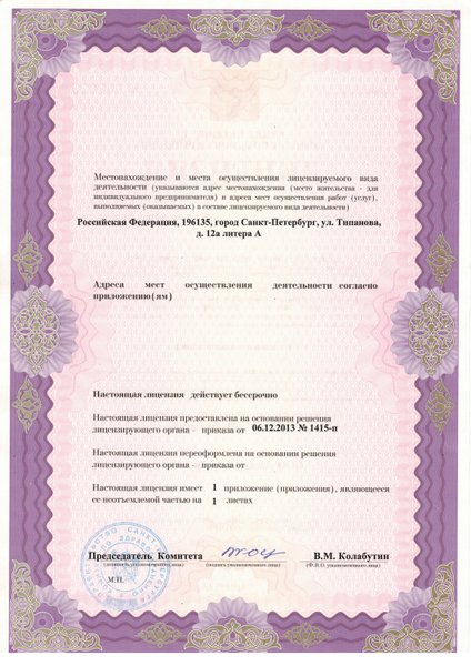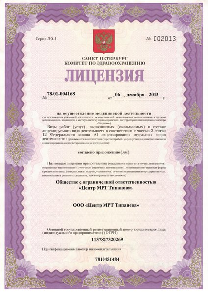 Лицензия на осуществление медицинской деятельности № 78-01-004168 от 6 декабря 2013г.