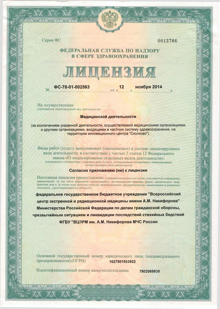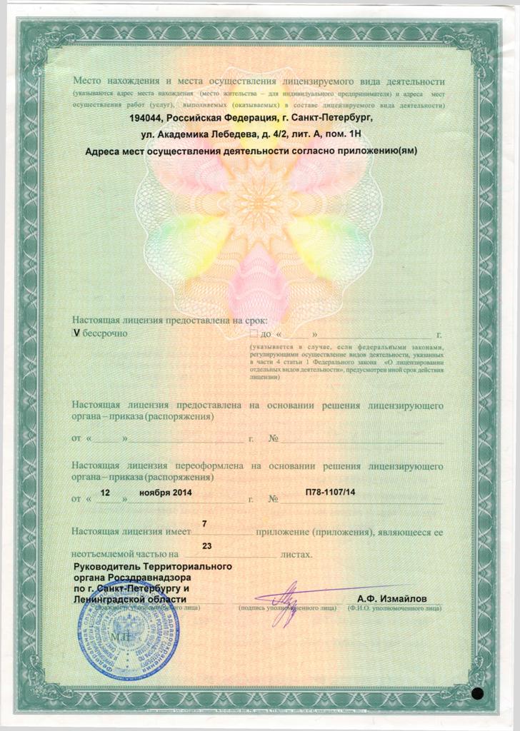 Лицензия на осуществление медицинской деятельности № ФС-78-01-002863 от 12 ноября 2014г.