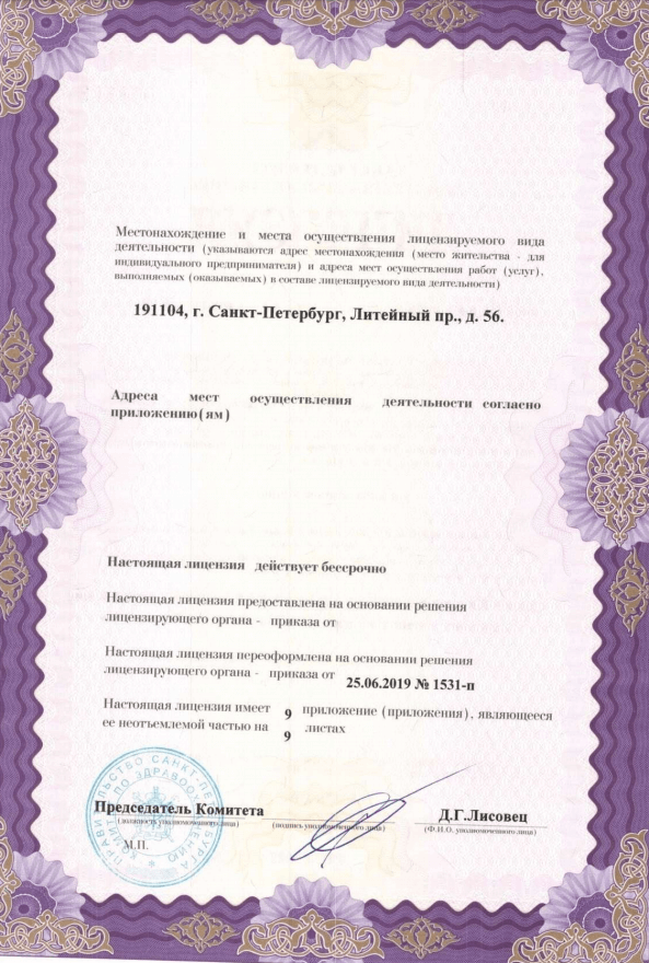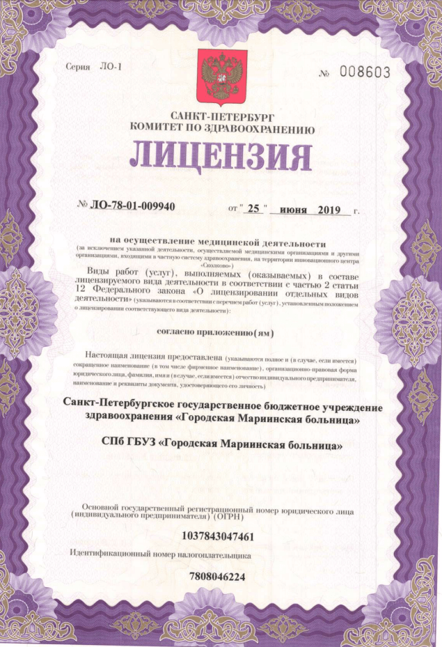Лицензия на осуществление медицинской деятельности № ЛО-78-01-009940 от 25 июня 2019г.