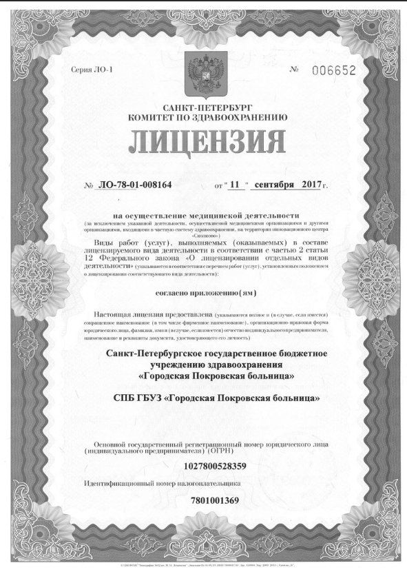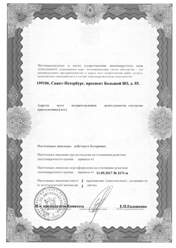 Лицензия на осуществление медицинской деятельности № ЛО-78-01-008164 от 11 сентября 2017г.