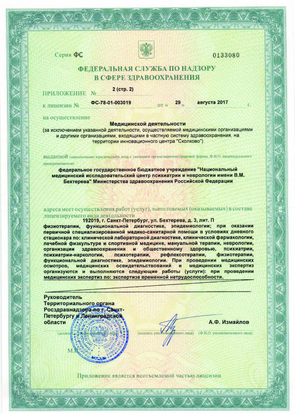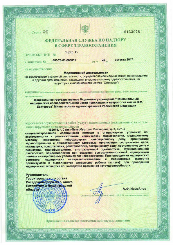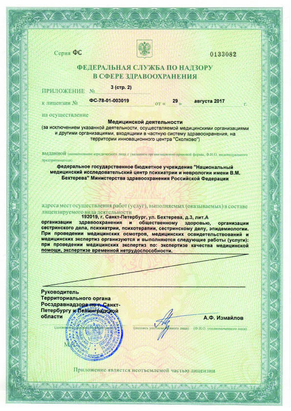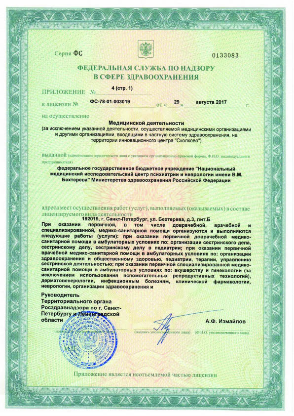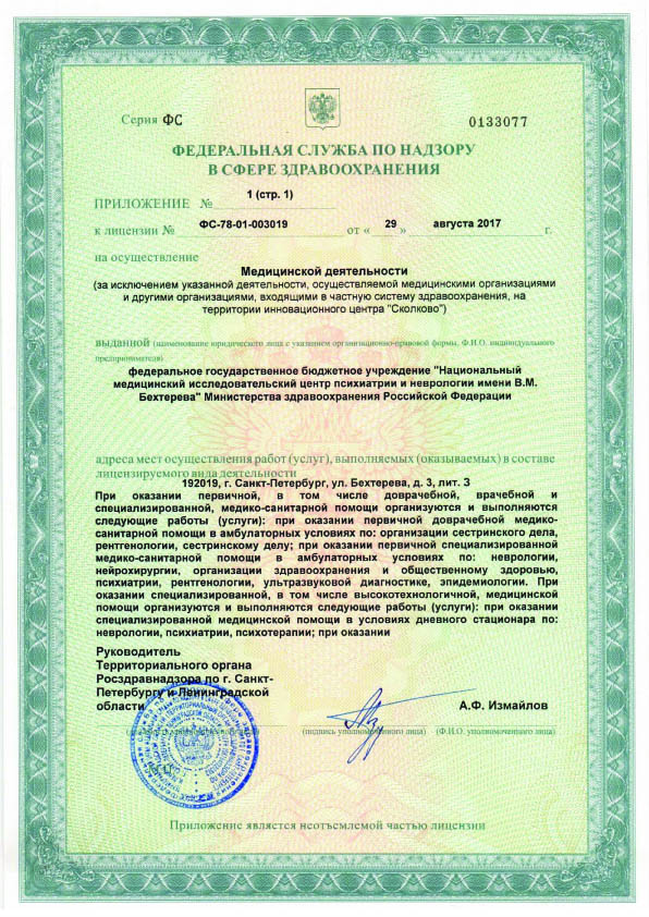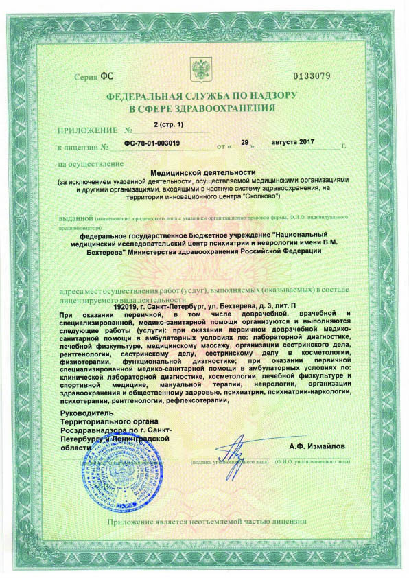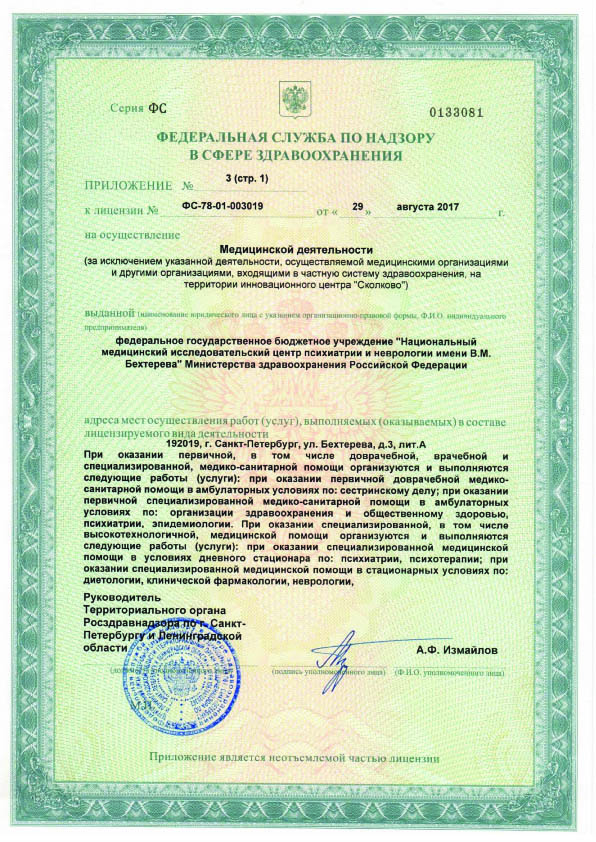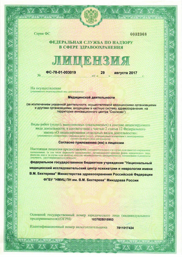Лицензия на осуществление медицинской деятельности № ФС-78-01-003019 от 29 августа 2017г.