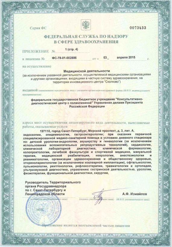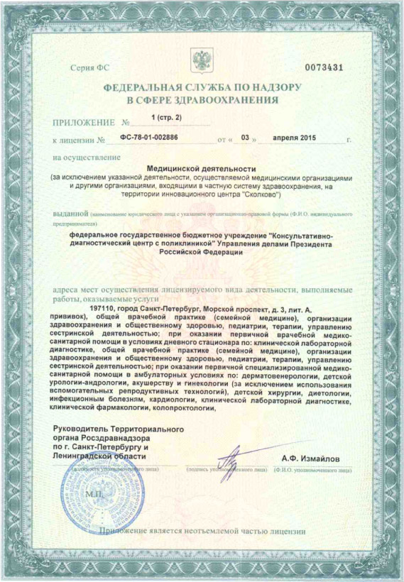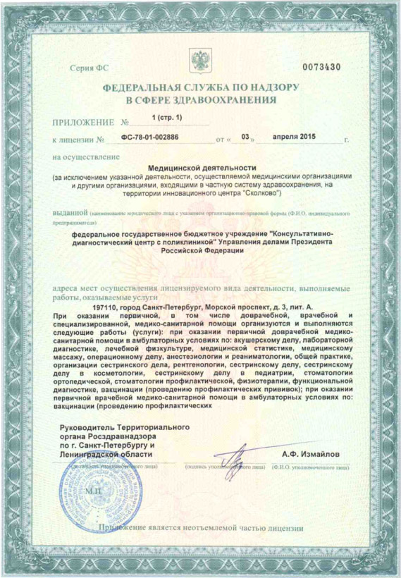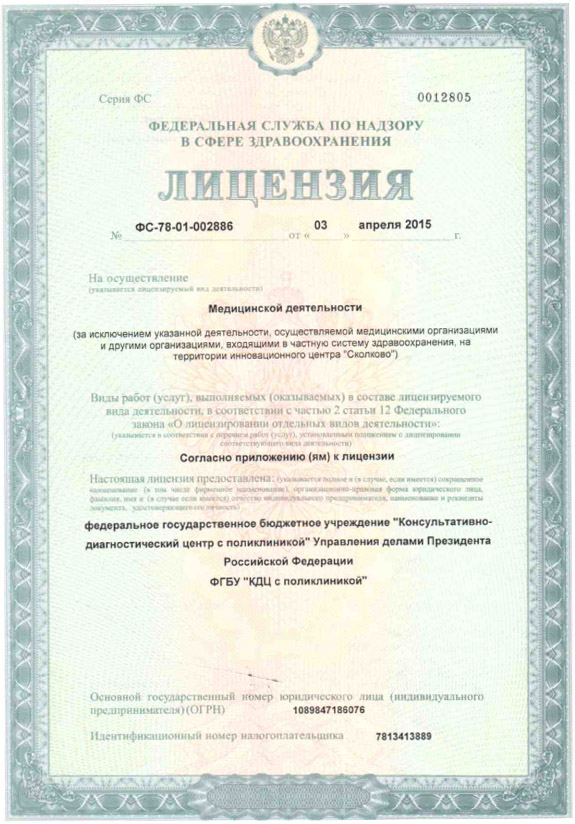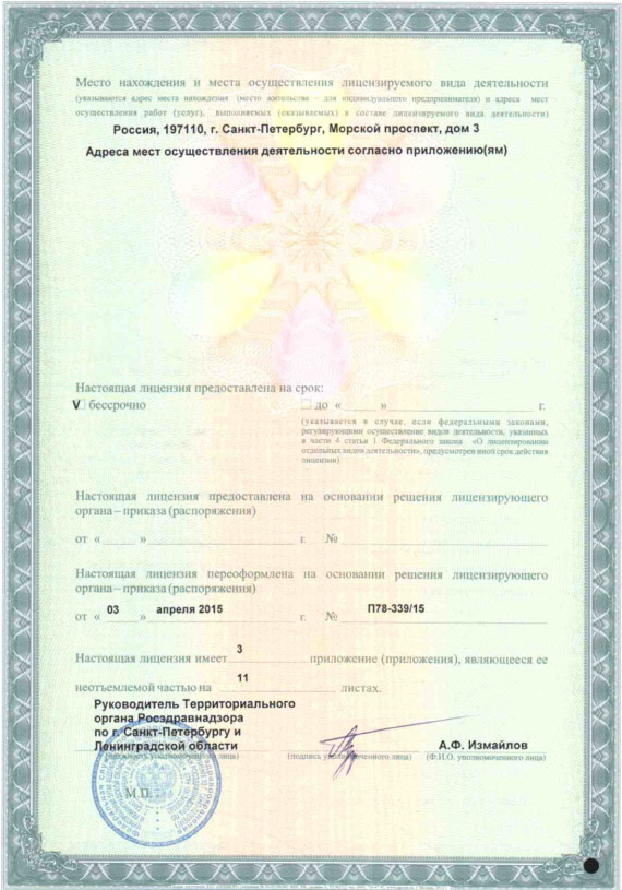 Лицензия на осуществление медицинской деятельности № ФС-78-01-002886 от 3 апреля 2015г.